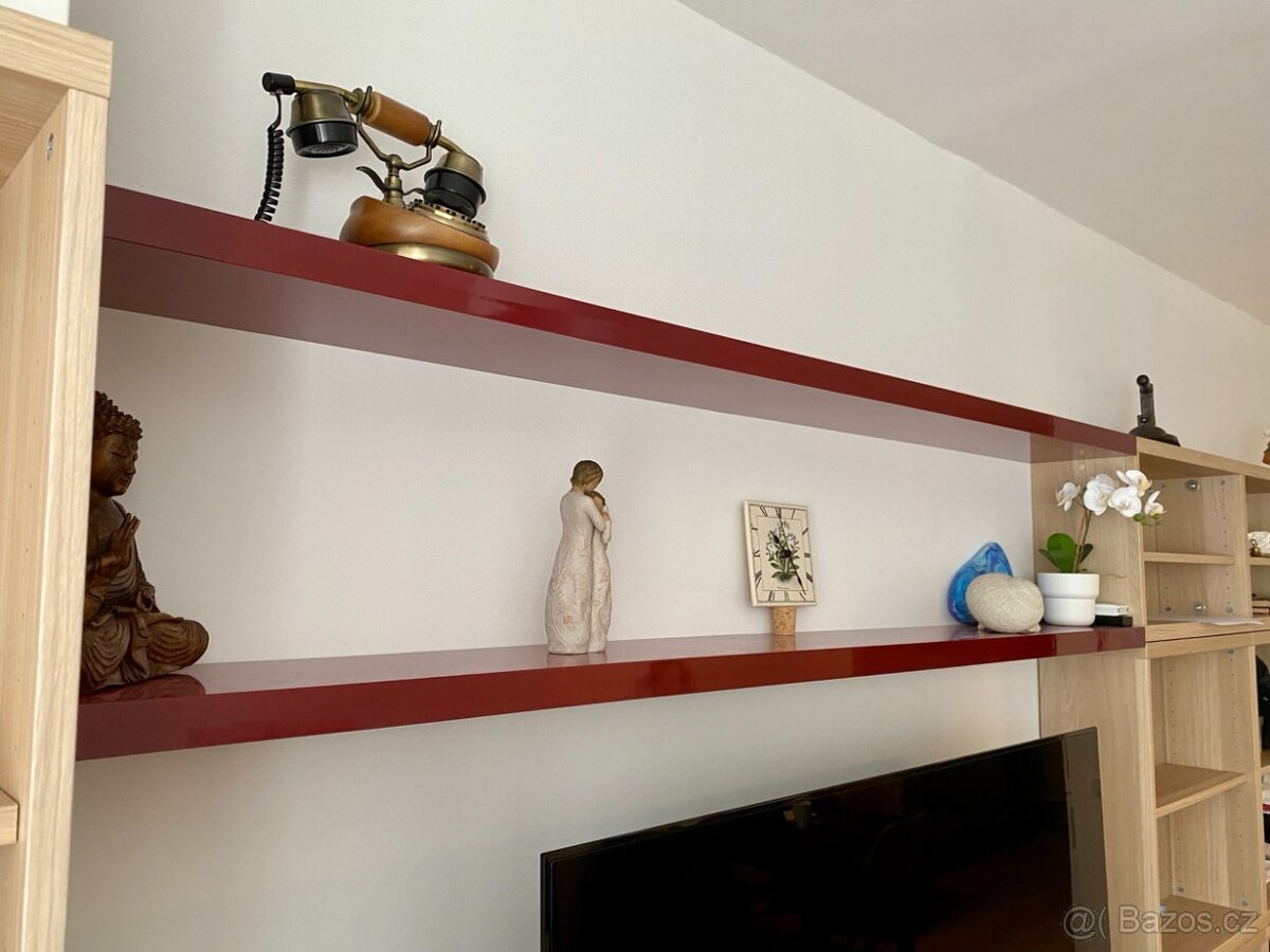 2x police o rozměrěch ŠxHxV 180x20x4 cm. Povrch lesklé vínové / tmavě červené lamino. Bez konzolí - neviditelné usazení. Součástí prodeje je 6 trnů pro osazení na stěnu (každá police 3 trny). Zakázková výroba. Vhodné (nejenom) pro kombinaci s řadou IKEA Besta. Jedna police má poškozený roh (viz foto) - ideálně seříznout o cca 4 cm, případně zavěsit s pomocí bočních konzolí, které vadu překryjí. K převzetí v Praze na Chodově.