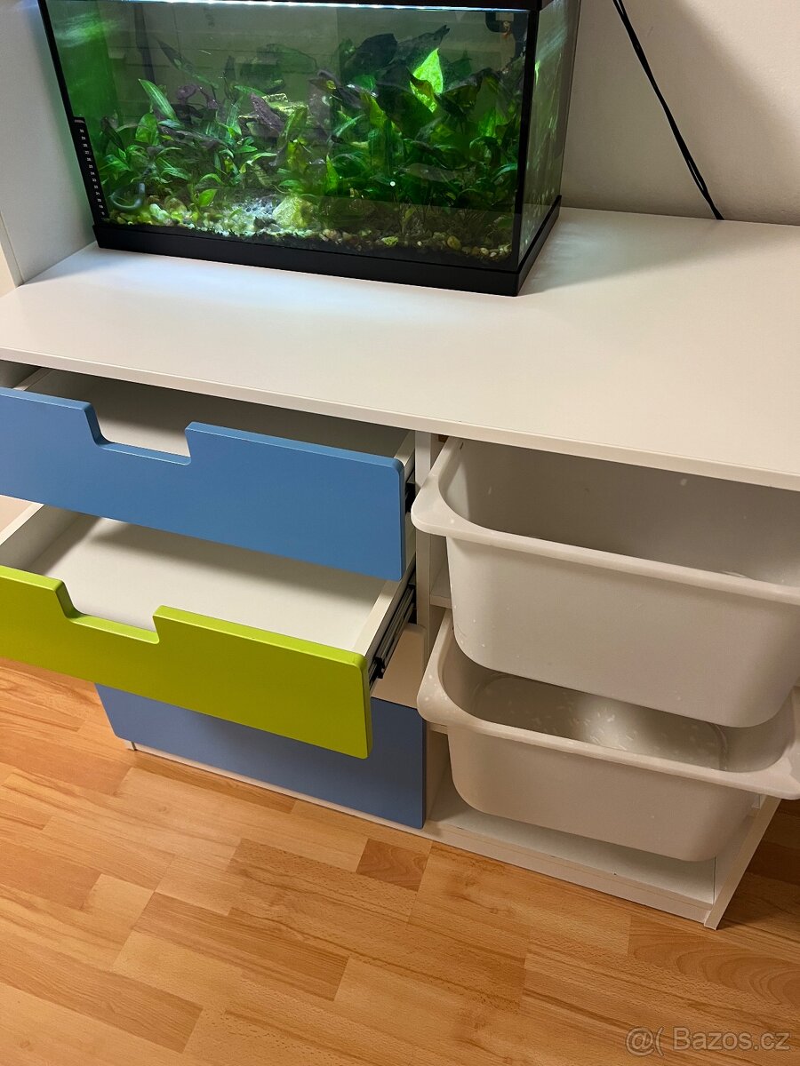 Prodám dětský nábytek. Komoda vyráběná na zakázku, může sloužit i jako přebalovací pultík. Šuplík na hračky je Ikea. Je k tomu i koš na hračky + molitan.