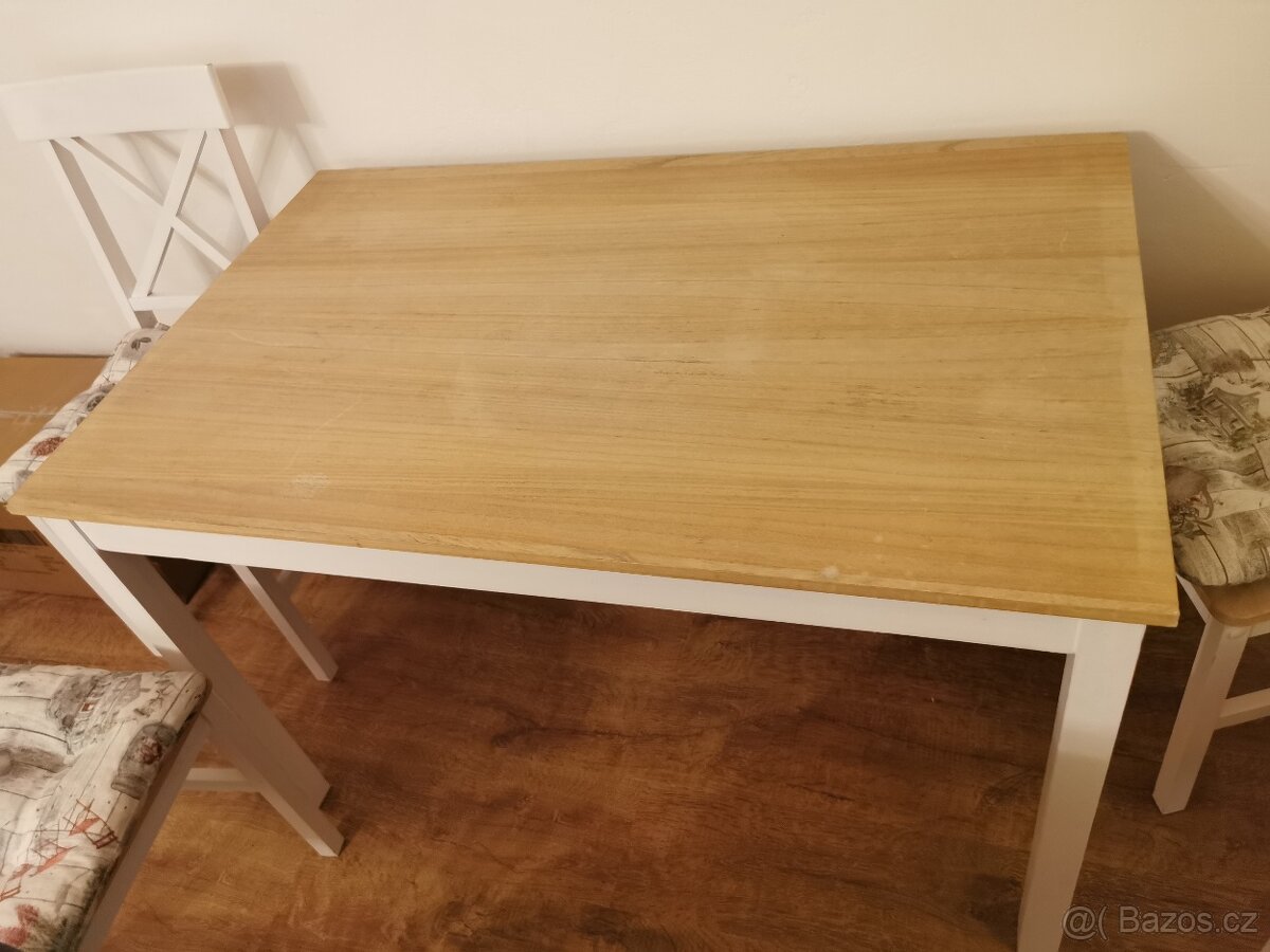 kuchyňský stůl a židle - kompletní set - [22.12. 2025]Prodám jídelní stůl a 4 židle viz foto. Stáří 5 let. Na židlích je piskovo žlutý potah - viz foto, který se dá měnit v různých barvách.