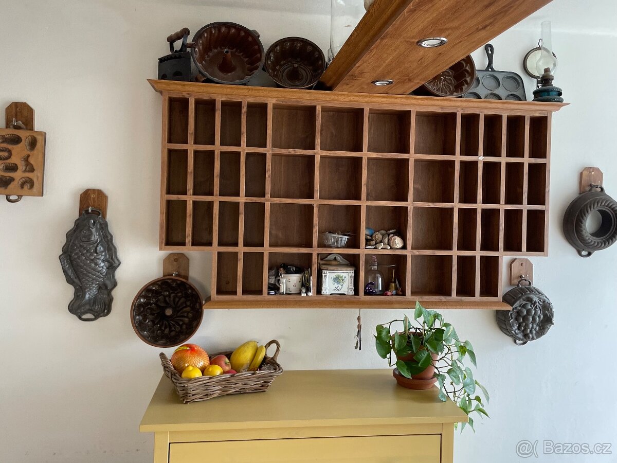 Výroba truhlářem ke kuchyni. Sloužilo na bábovky viz foto a police na vystavené hrnečky a jiné drobnosti, které jsme svého času sbírali.