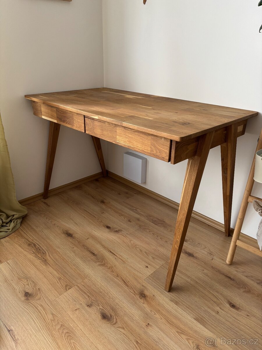 Prodám psací stůl z XXXLutz řada Linea Natura, materiál divoký dub (masiv), rozměr 120/65/76 cm. Používaný minimálně - patrné opotřebení hlavně na pracovní desce, sem tam ošetřeno olejem na dřevo. Jeden ze šuplíků prasklý v linii lepení dřeva viz foto - prasklo takto samo, určitě by šlo jednoduše slepit.
