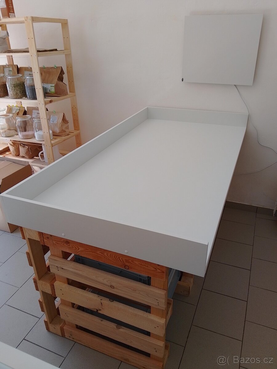 Oresi 1800 mm dlouhá, 920 mm široká, 38 mm tloušťky, přířezy (olemování) 150 mm vysoké, 18 mm tloušťky, vše lamino, pořizovací cena 8220 Kč, více info telefonicky