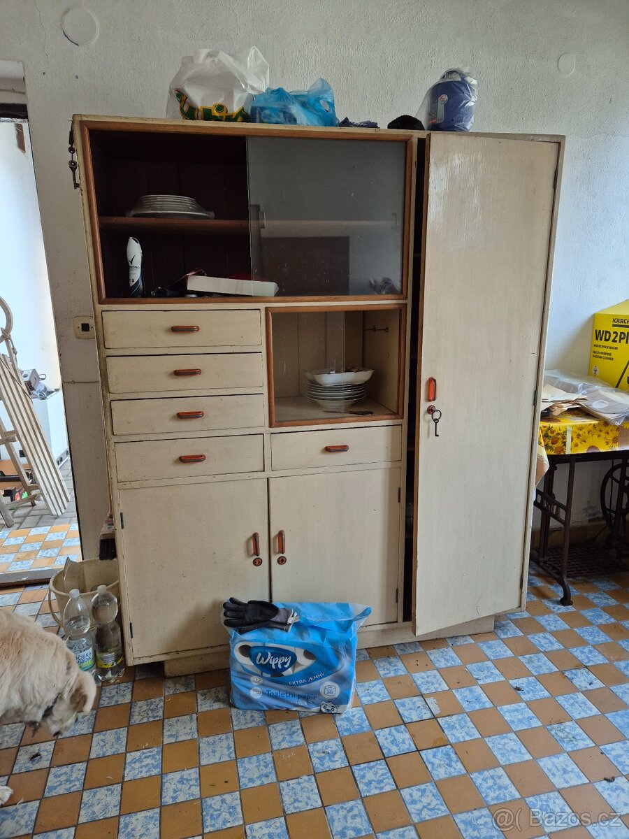 Prodej retro kredence 50. léta - [5.12. 2025]Zachovalá kredenc (nedávná renovace), částečně prosklená + potravinová skříň. Barva: slonová kost.