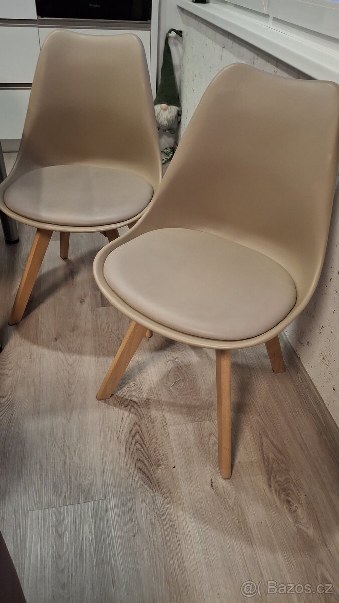 Prodám jídelní židle, plastové, barva latté s koženkovým sedákem, nohy masiv buk, 1 méně používaná u dvou se rozjíždí nohy, ale šikovný kutil si poradí....., jinak myslím v bezva stavu - viz foto, určitě poslouží. Jsou velice pohodlně, lehké.