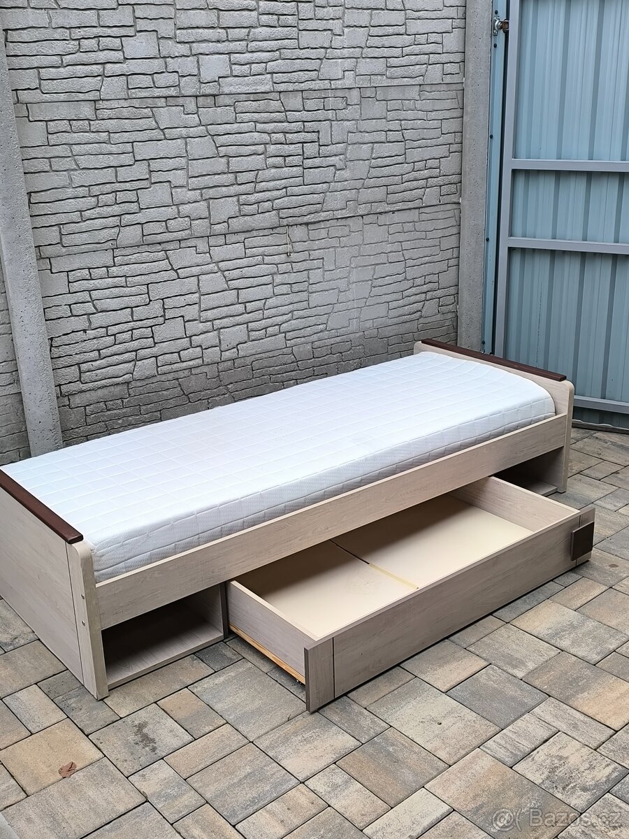 Prodám postel 80cm x 200cm s výsuvným šuplikem + Matraci ZDARMA. Postel nese známky používání, ale v celém je v dobrém stavu, konstrukce je pevná. Postel je rozmontována, šuplík je vcelku. Podívejte se na mé další inzeráty. K vyzvednutí Rostoklaty, vedle Uval. Můžeme se domluvit i na dopravě po Praze a okolí.