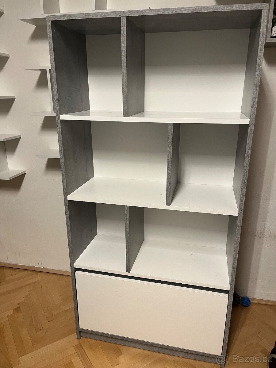 3 police, 1 zasuvka (suplik rozdeleny napul). Š80xV160xH34 cm