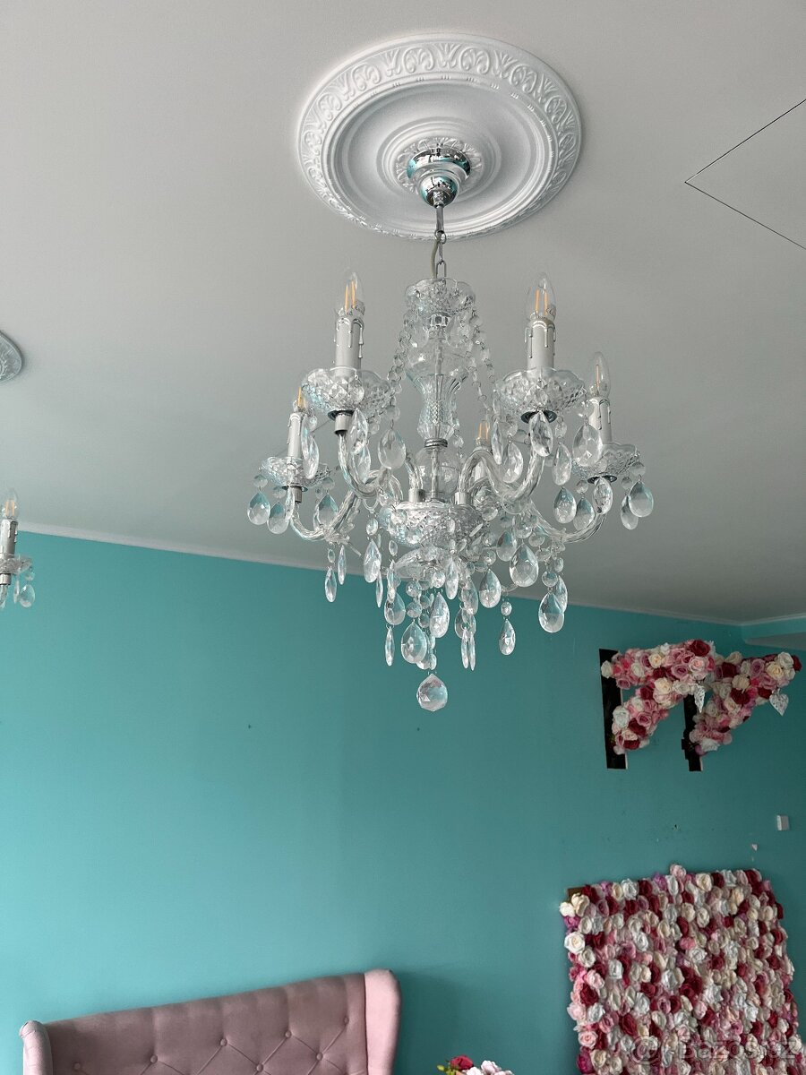 Lustry mají zkrácené řetízky/zavěšení (viz foto). Celková délka od stropu po poslední přívěsek je 72 cm.