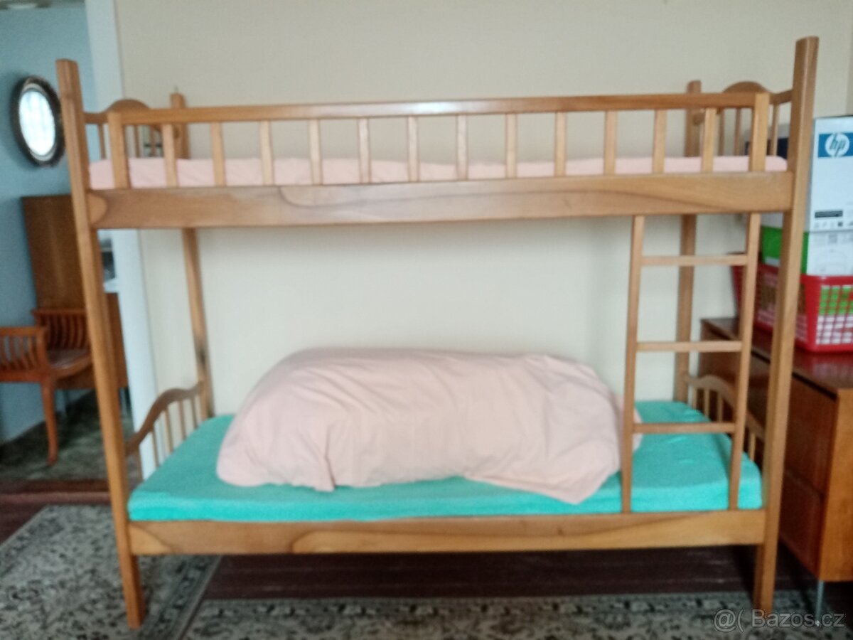 Zachovalá patrová postel, vč. lůžkovin (2x péřový polštář, 2x prošívaná peřina). K dispozici i 2x matrace, ale je to jen molitan. Postel je již v demontu.