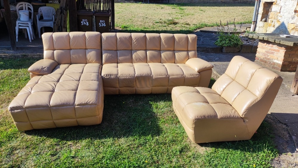Prodám starší, cca 5let starou používanou koženou sedačku z pravé kůže(béžová barva) a křeslo.Naprosto funkční a pohodlná. Běžné známky opotřebení úměrné stáří.Rozměry: Delší strana L: délka 175cm,výška 85cm,hloubka 90cm. Kratší strana L: délka 170cm,výška 85cm,hloubka 95cm. Křeslo: výška: 85cm,,šířka 80cm, hloubka: 90cm. Pc:85000kč. Po dohodě možno i odvoz za zozumnou cenu..Hořice. Volat pouze tento telefon: +420604429877