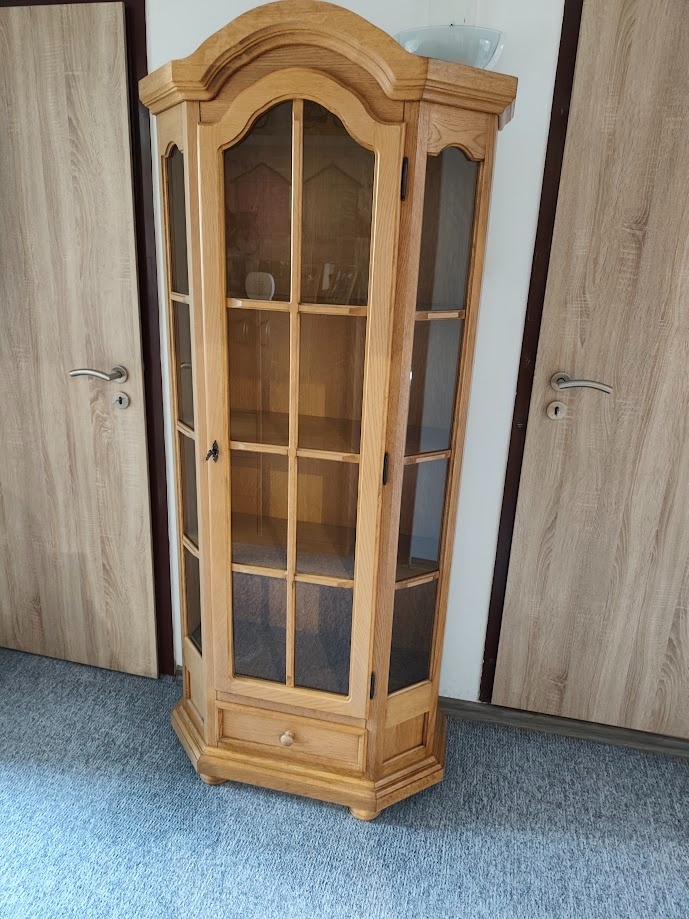 knihovna, vitrína, prosklená skříň - [14.12. 2025]prodám starožitnou vitrínu, rozměr 218 x 195 x 60 cm, jednodílná, nedá se rozebrat, Ostrava