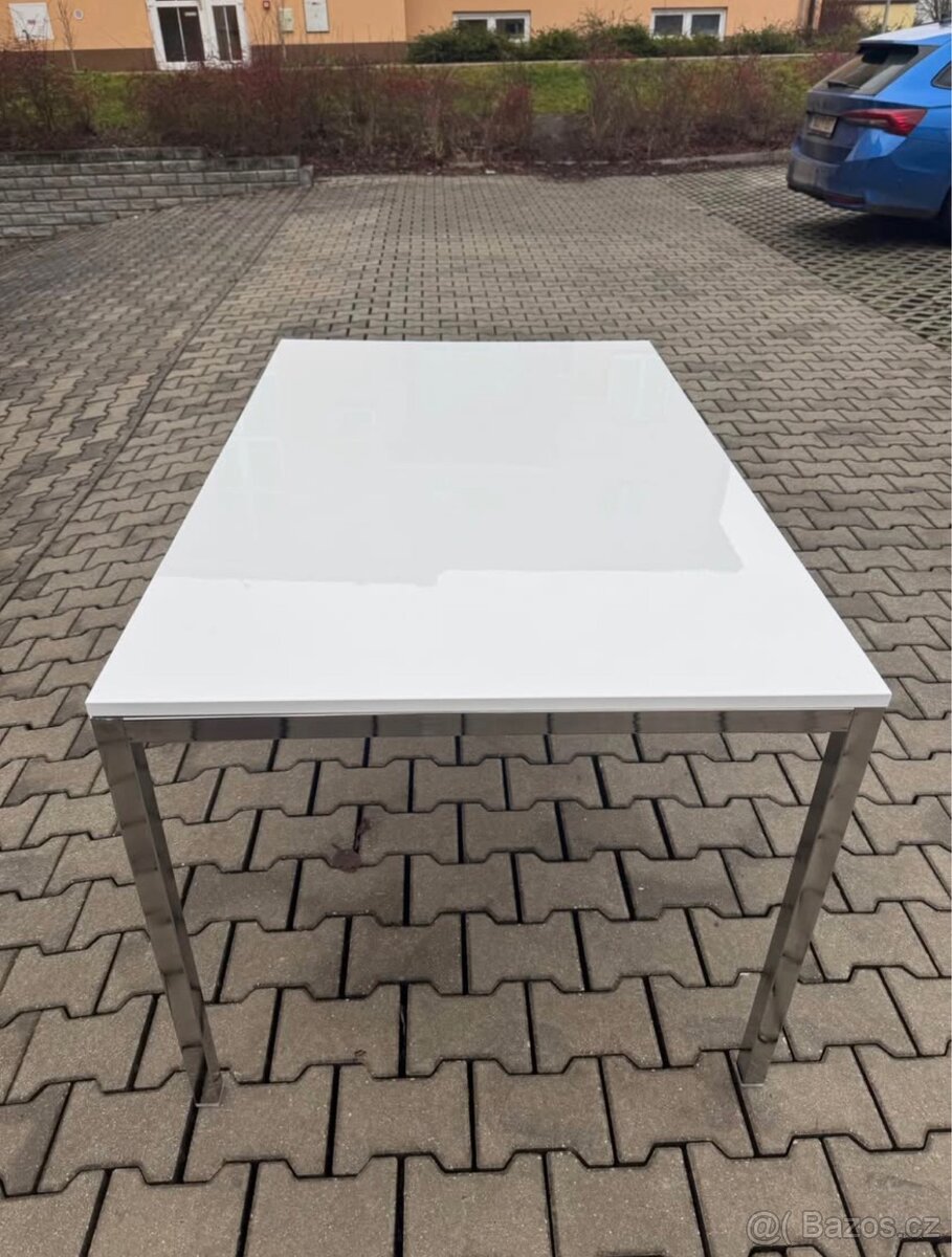 Moderní minimalistický design – bílá lesklá skleněná deska + nerezové nohy. Velmi stabilní a snadno udržovatelný.