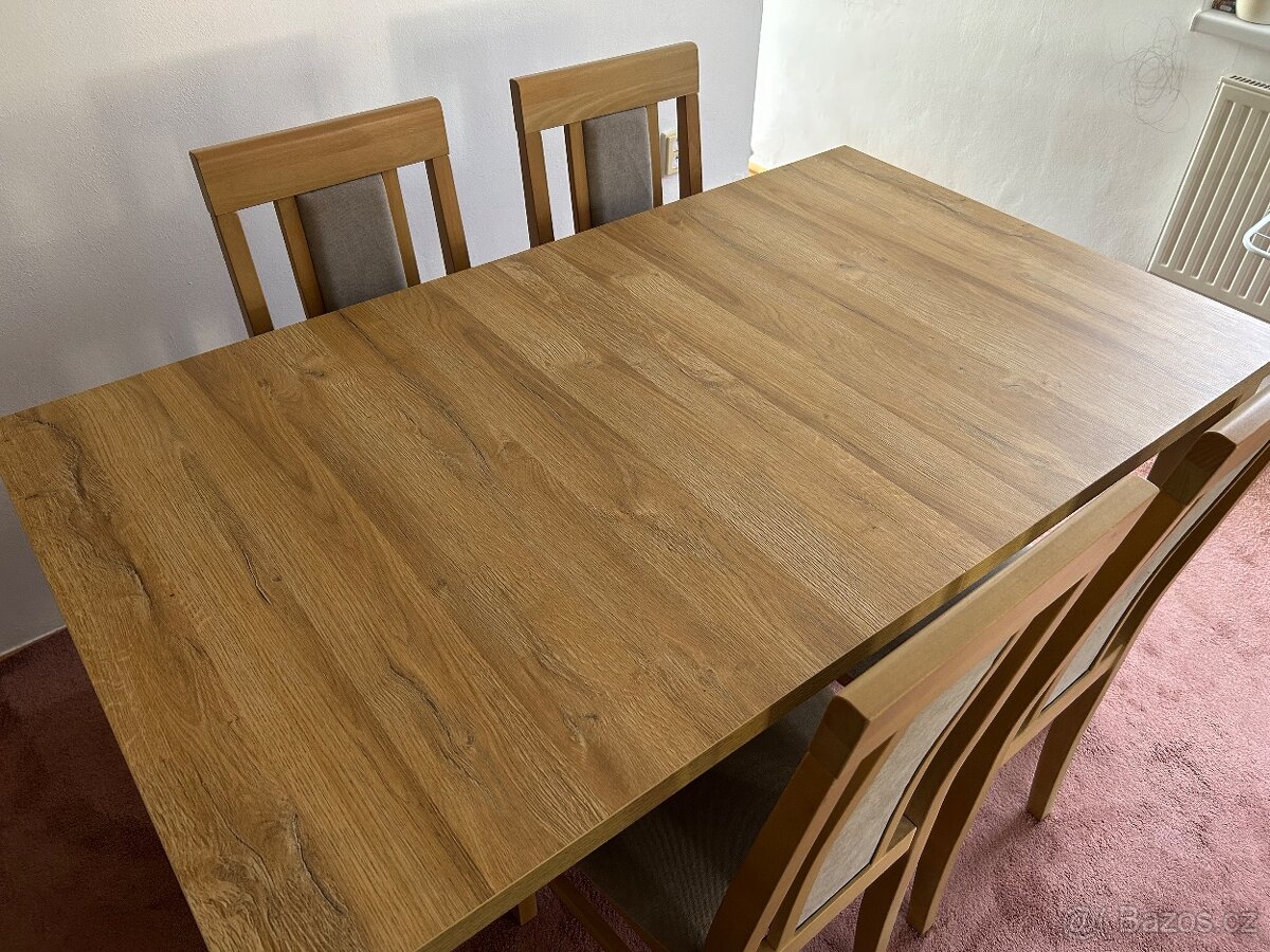 Krásný rozkládací stůl, který nese běžné známky užívání (pár oděrek na čalounění a dřevě), ale je ve velmi dobrém stavu, využíván málo. Stůl je možné odebrat v setu se 4-6 židlemi - jedna židle je bohužel ohryzaná od štěněte, viz fotografie