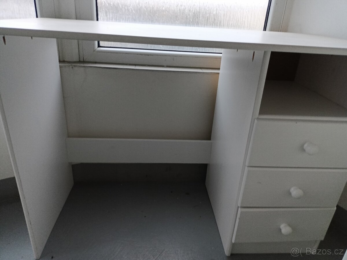 Prodám bílý nepoužívaný pracovní stůl. Při manipulaci se nám podařilo pár oděrek - vyfoceno. Je krásný, deska nepoškozená. Tři šuplíky. Rozměry na fotkách.