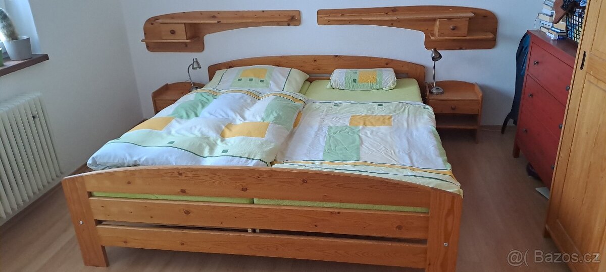 Nabízím manželskou postel z masivu s rosty, nočními stolky a polickami. Bez matraci, odvoz vlastni.
