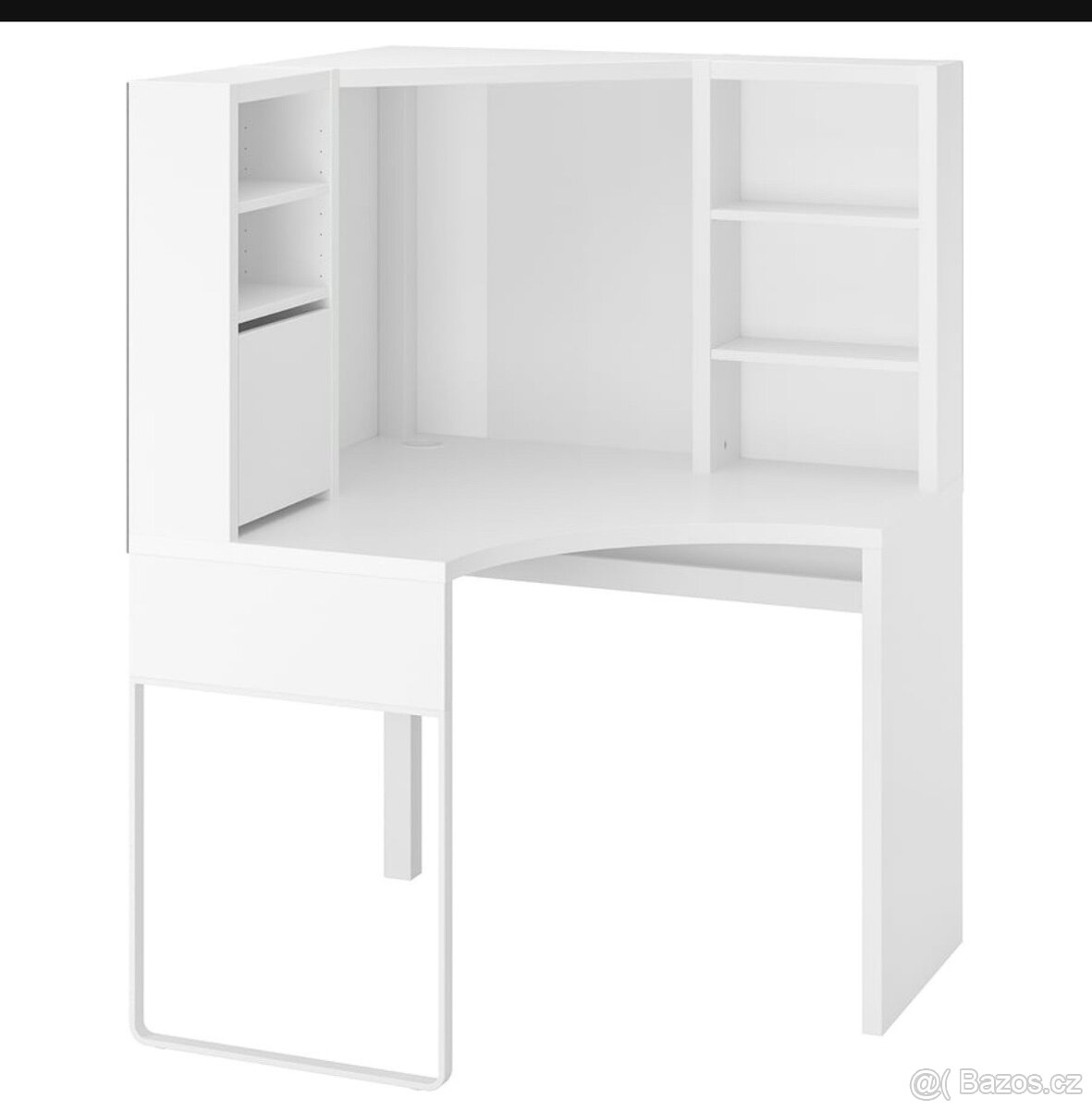 Prodám rohový pracovní stůl v bílé barvě s horní nástavbou, policemi a magnetickou tabulí v dobrém stavu. Stůl nabízí velkou pracovní plochu a praktický úložný prostor.