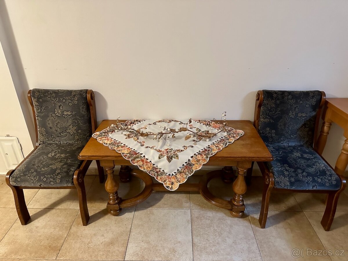 Nabízím dvě stylová křesílka a konferenční stolek v rustikálním designu, vše ve velmi zachovalém stavu. Stůl má vrchní desku o rozměrech 60×130 cm s lehkou barevnou patinou, která mu dodává charakter. Prodávám pouze jako komplet. Skvělý doplněk do obýváku, pracovny nebo chalupy.