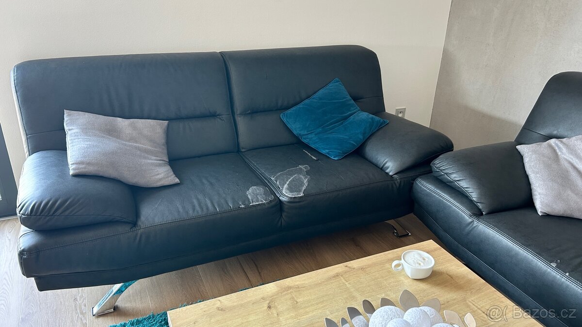 Sedací pohovky 3+2. Rozměr dxšxv 228x94x84 a 188x94x84. Staří 4 roky. Koupeno ve Sconto. Materiál koženka. Loupe se viz foto. Jinak žádné poškození, poškrábání ani prosezení. Pouze tato estetická závada. Původní cena za komplet 20 tis. Sleva možná.