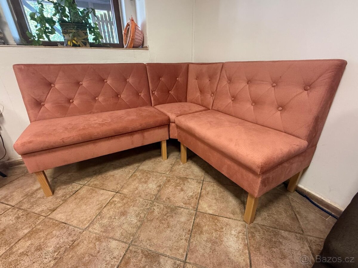 Roh je pravý a levý (variabilní) při montáži si můžete vybrat. Nábytek tvoří tři prvky, rohový blok a dvě boční lavice. Nohy jsou pevné z tvrdého bukového masivu hranol 4x4 cm se závitem. Korpus je z DTD desky.