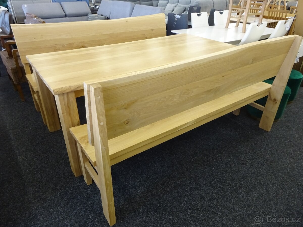 materiál dub, celomasiv, spárovka pruběžná, ošetřen 2x vodou ředitelným lakem, vhodný do krytých prostor, horní deska z 5cm fošny, rozměry stolu: 90 až 93cm x 199cm, noha 11x11cm, v ceně nejsou lavice, více informací poskytnu na