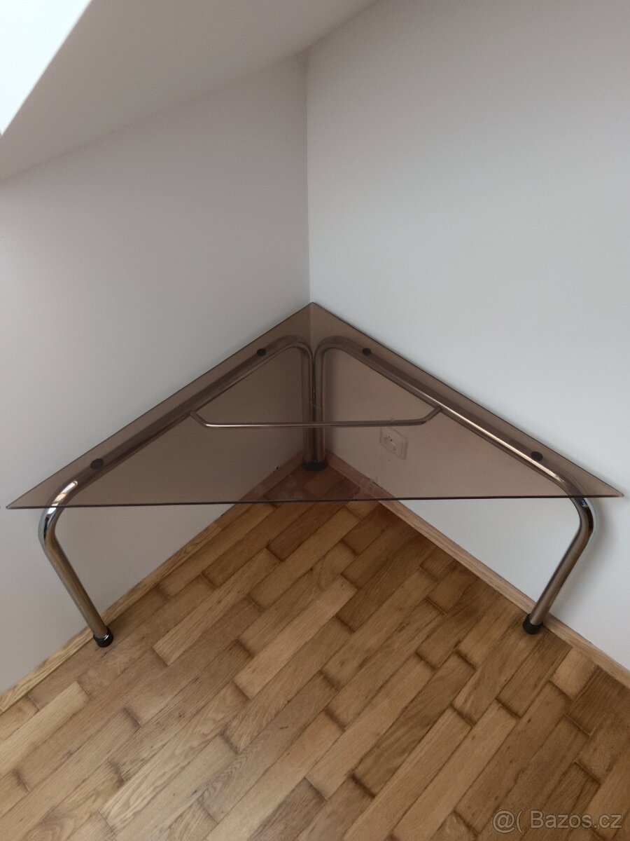Prodám skleněný rohový stůl, rozměry viz. foto, výška od zeme 53 cm. Stav viz. foto. Pouze osobní převzetí. Cena 300 Kč.