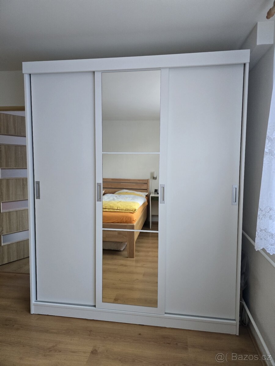 Nabízím pěknou velmi zachovalou šatní skříň s posuvnými dveřmi. Prostřední dveře mají zrcadlo. Jsou v ní 2 kovové šatní tyče a 9 polic. Vše se dá rozmístit podle sebe. Je vhodná do ložnice nebo chodby. Rozměry: š. 180 cm, v. 220 cm, hl. 60 cm. Je vyrobena z bílého lamina o síle asi 1,9 cm, má kovové vedení pro posun dveří. Původní cena byla 10.000. Nyní 2.500,-, sleva možná. Prozatím je sestavená (pro představu), pomohu s demontáží.