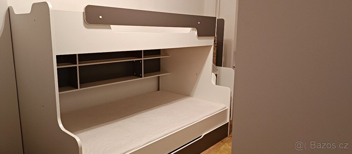 Prodám dětskou poschoďovou postel Henry včetně matrací. Postel je vyrobena z bílého lamina v kombinaci se šedou barvou. Spodní lůžko má rozměr 120x200 cm,dolní lůžko 90x200 cm. Schody lze nastavit na levou nebo pravou stranu. Pouze osobní odběr. Při rychlém odběru sleva.