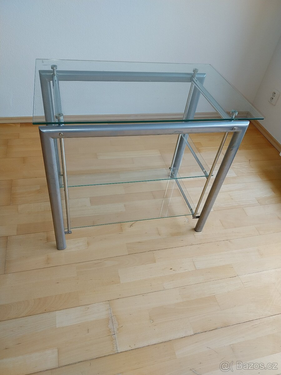 Prodám moderní skleněný TV stolek se třemi policemi. Top stav, nepoškozeno. Dle fota. Rozměry výška 69, délka 79, hloubka 49.Spěchá.