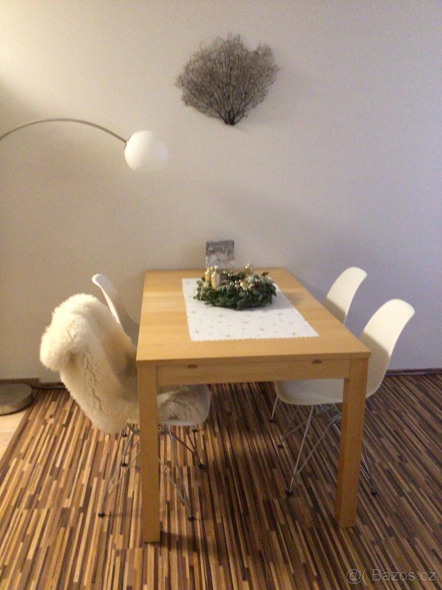 Prodám jídelní stůl Ikea a 4 židle zn. Panton Vitra (kopie) celkem za 3.600 Kč. Rozměry stolu: 84x140 cm, výška 75 cm. Lze ho i rozložit. Původní cena stolu byla 3.900 Kč; původní cena 1 ks židle byla 1.300 Kč. Pouze osobní odběr Brno-venkov. Tel. 737 646 030