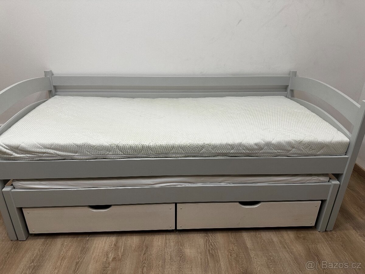 Postel i matrace v pěkném stavu. Barva- světle šedá,šuplíky bílé. Cena včetně matraci.