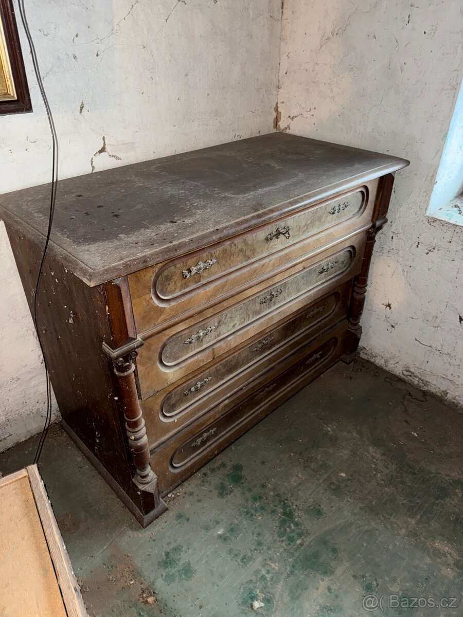 Prodám komodu starožitnou, k renovaci , cena 1000 Kč .(storožitnost, sběratelsví, starožitnosti, retro, skříň, skříňka, )obec Blatec.
