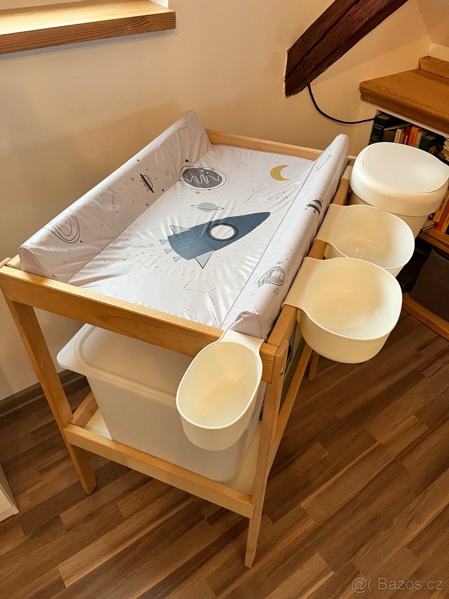 Prodám přebalovák IKEA. Matrace,spoustu přihrádek,odpadkový koš,boxík na plenky,látkové přihrádky. Vše krásné ,nezničené.