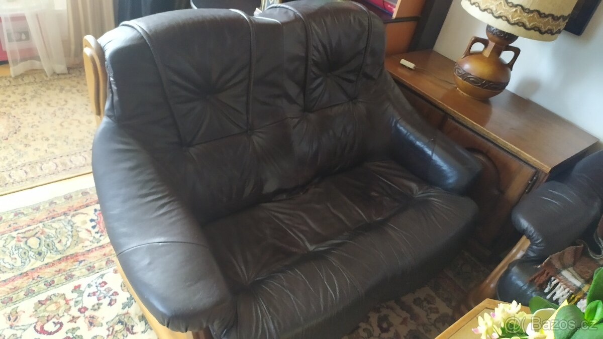 Kožená sedací souprava(jen dvojsedačka) - [24.12. 2025]Prodám koženou dvojsedačku s masivním dřevem.