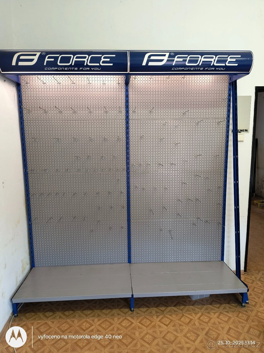 Nabízím 2ks velice bytelných regálů s háčkovým systémem od fa. Unior cena za kus . Rozměry 220 x 103 cm. Regál má osvětlení a nápis Force je samolepka a dá se odstranit. Vhodné do domácích dílen i do prodejny. Osobně jsem si dal jeden doma do dílny na nářadí. Pořizovací cena byla vyšší. Prodej možný i po kuse. cena za Kus 3500,-