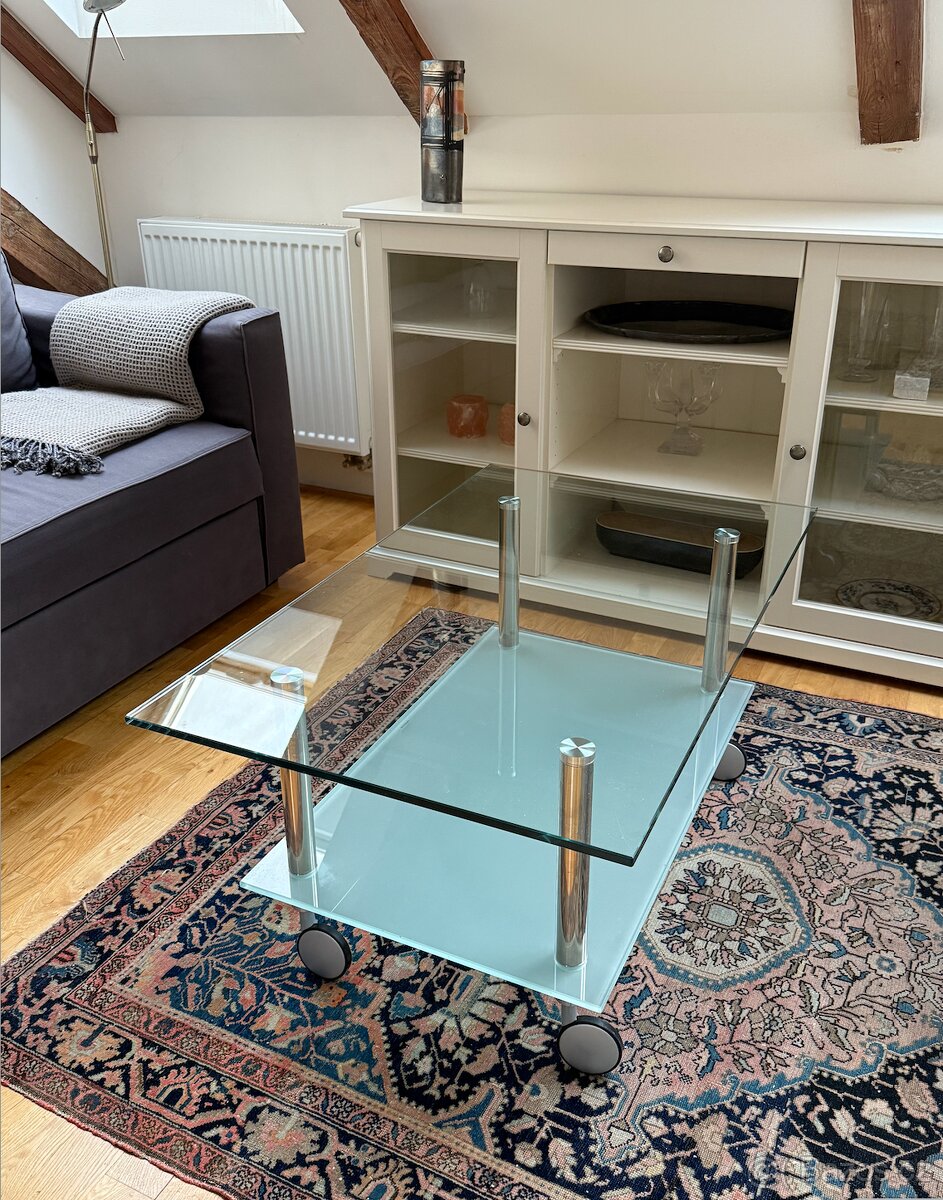 Skleněný konferenční stolek ve 100% stavu. Rozměry délka 100, šířka 60, výška 47 cm.