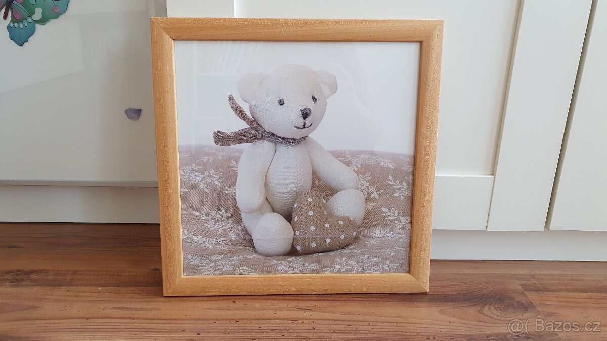 Obraz medvídek. Rozměr 34 x 34 cm. Dřevěný rámeček, sklo. Kvalitně zarámovaný v rámařství, nevybledlý. Předání v Českých Budějovicích nebo poslání.