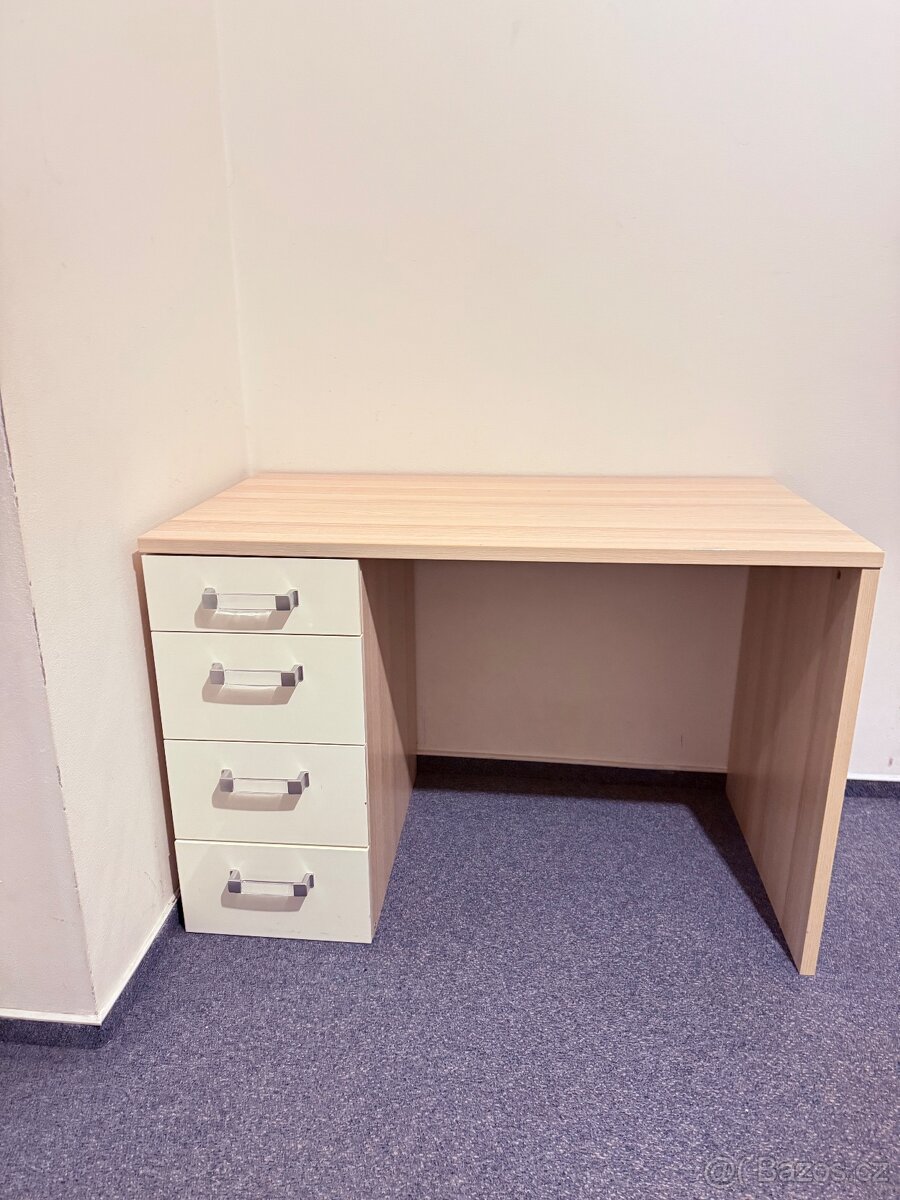 Prodám praktický psací stůl v moderním, jednoduchém designu. Stůl má pevnou pracovní desku v dekoru světlého dřeva a čtyři prostorné zásuvky po levé straně. Vhodný do pracovny, studentského pokoje nebo kanceláře.