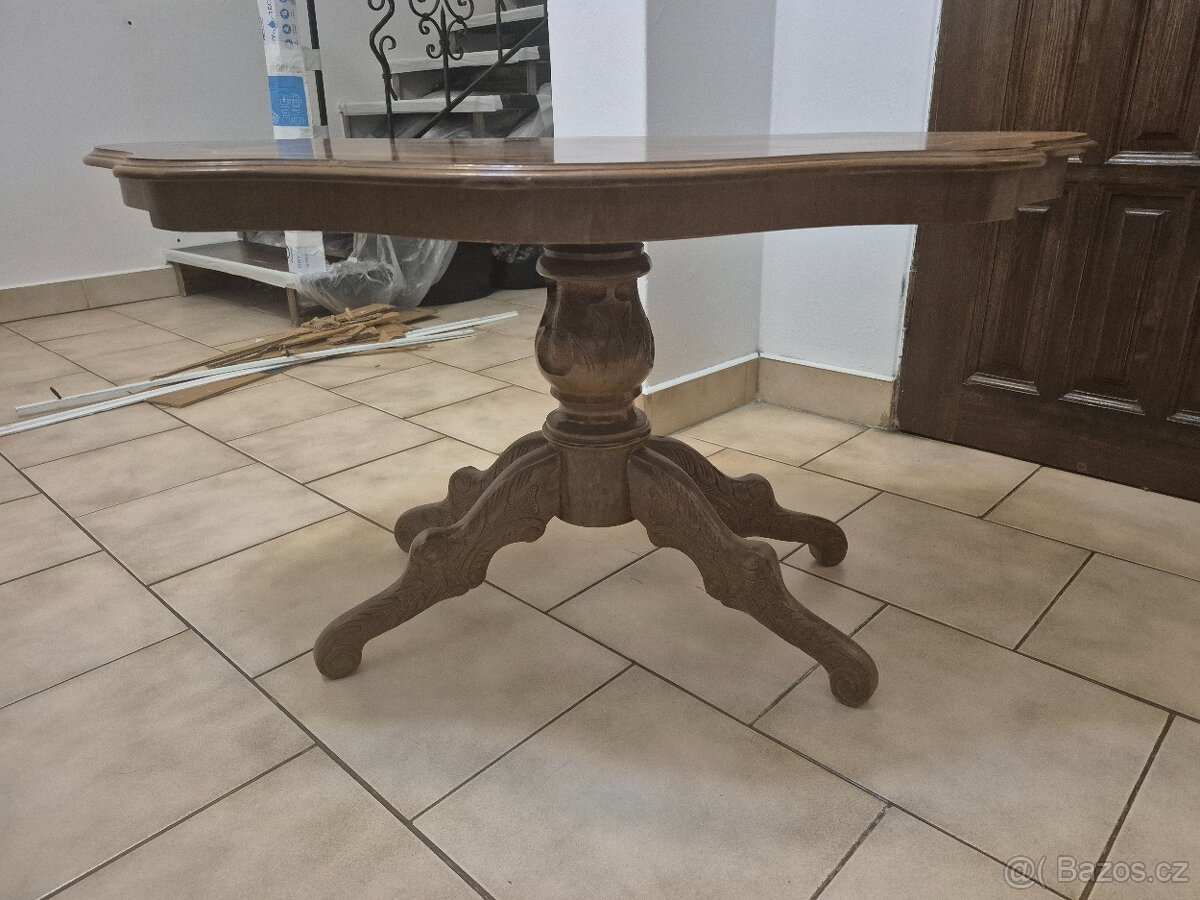 Vrchní deska je dýhovaná s intarzovanou kresbou, noha masivní a vyřezávaná.
