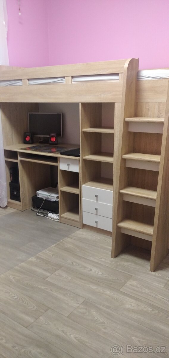 Postel, psací stůl, skříň, poličky. Praktický a ušetří hodně místa. ZDARMA he roštu a matrace. Vše je v pěkném stavu, jsou menší známky použití. Osobní odběr v České Lípě.