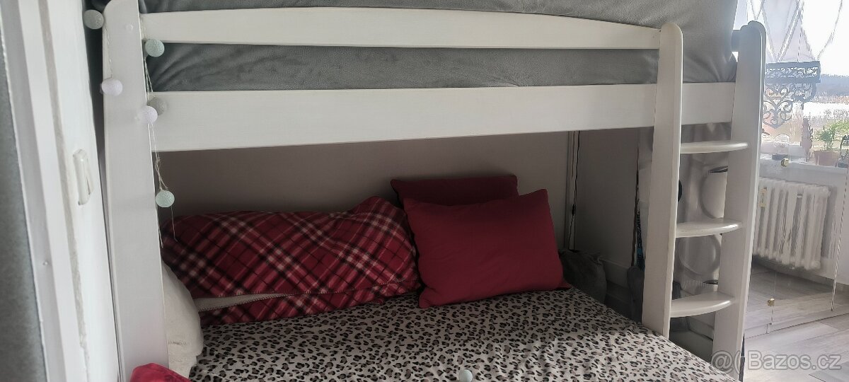 Prodám poschoďovou postel dřevěná smrková s matrací a roštem míry cca 2M x 90cm x 160 cm