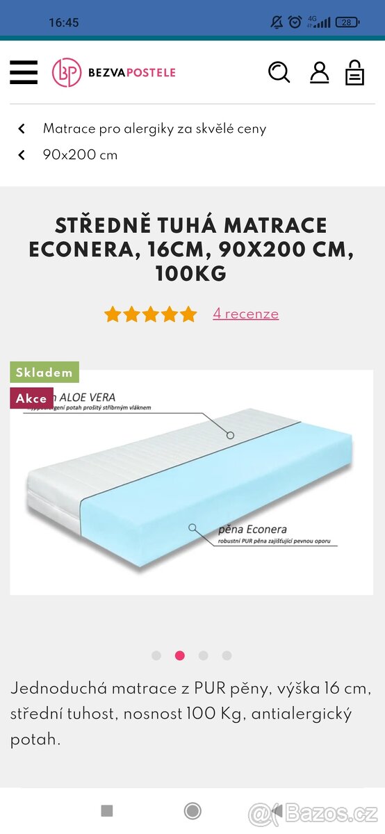 Prodám matraci, používanou půl roku. Je v dobrém stavu. Výrobcem inzerovaná jako středně tvrdá. Mně přijde měkčí, spíše pro lehčí osobu, pod 70 kg. Z PUR pěny, antialergická, 16 cm vysoká.