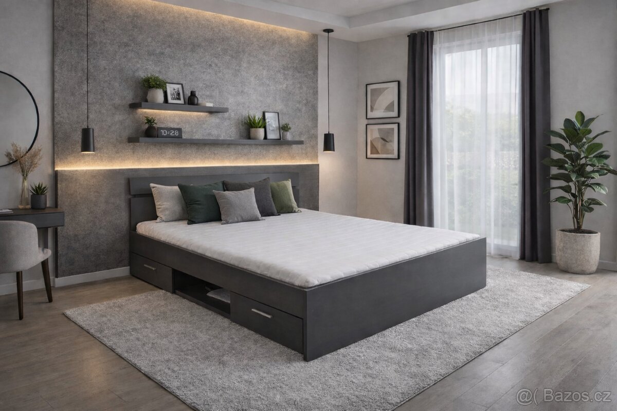 Multifunkční postel 160x200 zásuvkami, rošty a matrací. Šedá - [4.1. 2026]Multifunkční manželská postel se spací plochou 160x200. Postel je kompletní s rošty v pevném rámu a matrací zdarma. Praktické úložné prostory - 2x postranní zásuvka a 1x prostřední knihovna. Rozměry 165x205x75. Dopravu, montáž a likvidaci starého náb ...