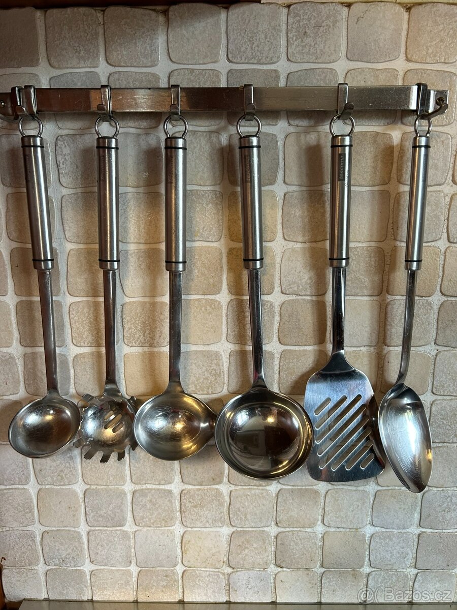 Prodám krásnou velkou sadu tescoma příslušenství GrandChef. Zahrnuje například naběračky, metličky, škrabku na brambory, otvírák, obracečku, nůž na sýr, kopečkovačku na zmrzlinu apod.