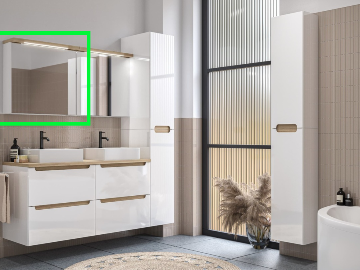 Zrcadlová skříňka je shora vybavena LED osvětlením 4W , teplota světla 6400K, 200Lm, s krytím IP44 proti stříkající vodě a zásuvkou na 220V.