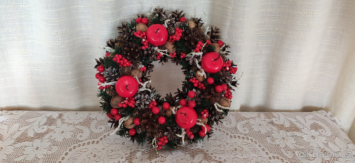 Věneček o průměru 33 cm, na polystyrenovém základu, doplněný šiškami, umělými jablky, umělými větvičkami a přírodninami. Cena 350 Kč + 90 Kč zásilkovna. Cena na účet.