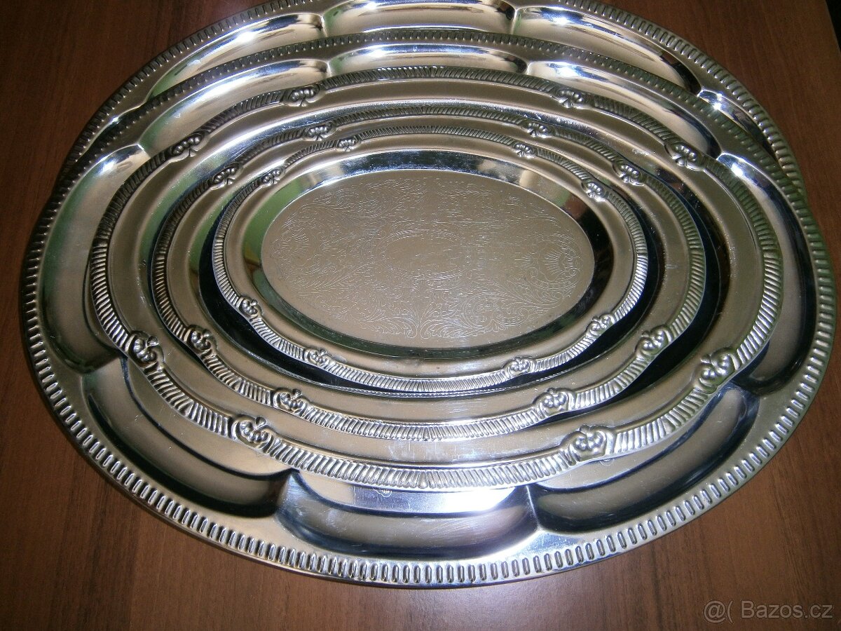 Nabízím sadu pěkných táců 5ks - 160,-, 1 nerezový tác (4misky) 65,-, velký kulatý, zdobený tác 70,-Kč.