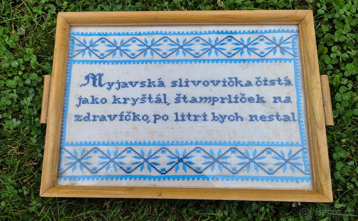 Starý tácek na ,panáčky, stará výšivka