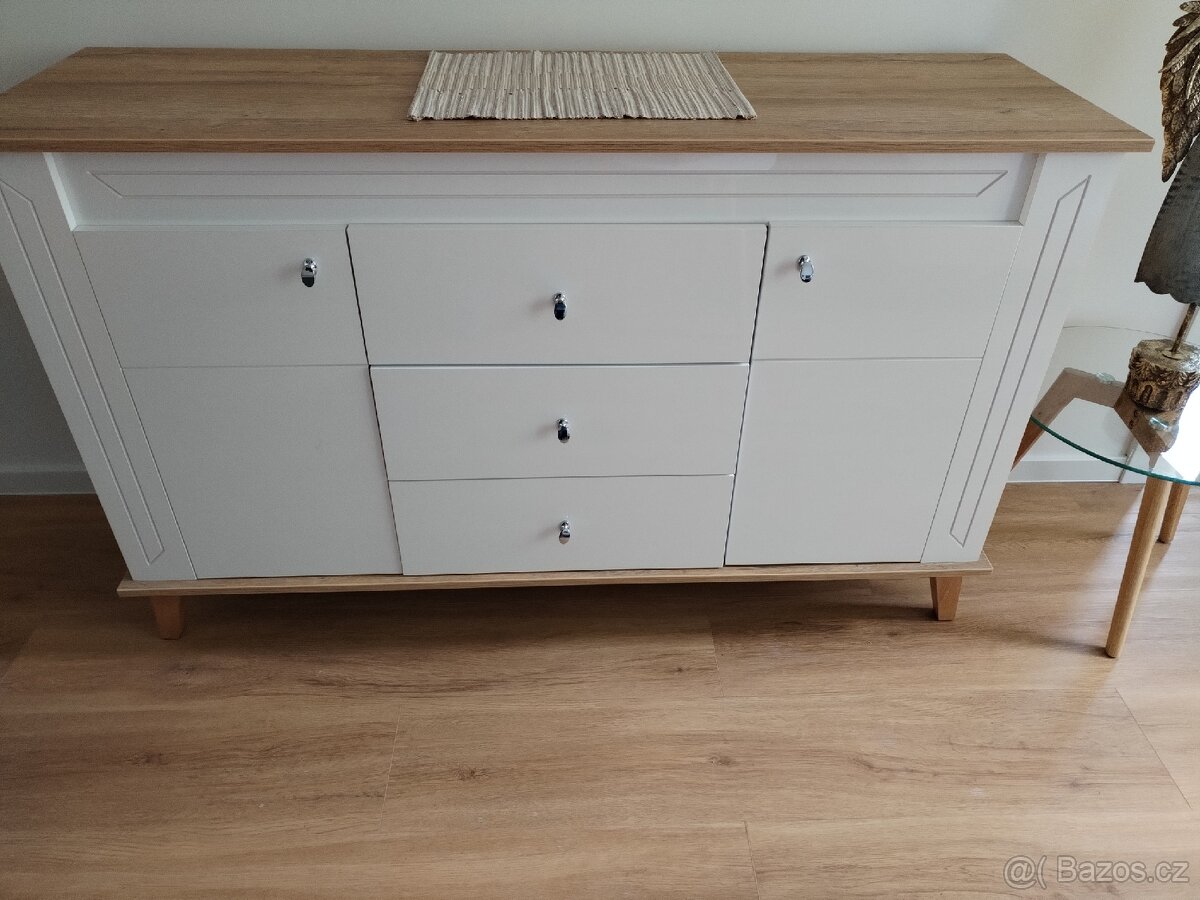 Prodáme z důvodu stěhování a menších prostor tuto skříňku v absolutně bezchybnem stavu. Korpus imitace dřevo, dvířka + čela šuplíků + orámování lakovaná, barva krémová bílá. 2 x dvířka + 2x polička, 3 x šuplíky. Délka 144cm, výška 89 cm, šířka 44 cm. Skříňka stojí na dřevěných, bytelnych nohách, celkem 5. Skříňka, jak již napsáno, je v super stavu, bez jediného škrábance, velmi pěkná. Stáří 3 roky. V případě zájmu máme další 3 skříňky z této sestavy, 1 skříňka - výška 190 cm, širka 104cm, hloubka 39 (knihovna s prosklenými dvirky) - 2400,-, 1 skříňka - výška 130 cm, šířka 109 cm, hloubka 44 cm (jedna dvířka zčásti se sklem) - 2300,-, 1 skříňka pod TV - délka 124 cm, šířka 44cm, výška 89 cm - 2300,-, všechny stejného stylu jako tato. Takže je pak možné prodat komplet jako sestavu. (viz další fota) Cena je nyní pouze za tuto inzerovanou skříňku. Všechny jsou ve stejném super stavu, jako je tato.