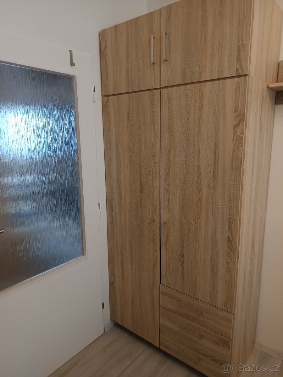 Prodám 2 ks satních skříní s nástavcem půl police půl věšák, 3 šuplíky. Jedné chybí krycí deska soklu. Cena 700 za kus v- 214, š-95,h-50