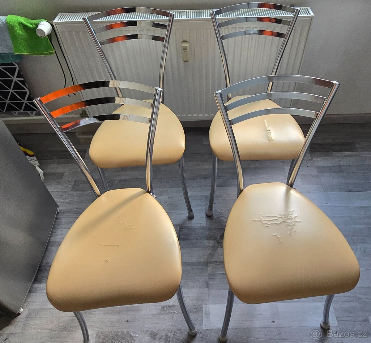Prodám 4 x židle, koženku na sedácích nutno vyměnit/opravit, jinak dobré bytelné židle se silikonovou ochranou na nohách proti poškrábání podlahy.