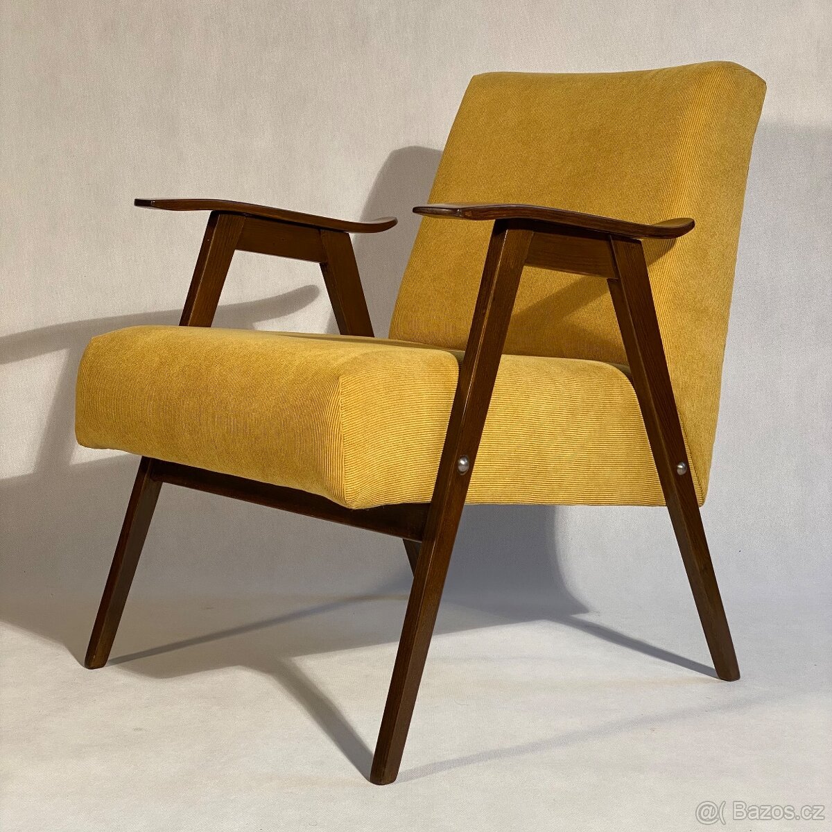Predám toto veľmi pohodlné retro kreslo “Brusel”, ktoré bolo profesionálne zrenovované - kompletne rozobraté a vyčistené, spevnené v spojoch, vymenené popruhy a všetky výplne. Drevo bolo vybrúsené, napustené moridlom - hnedý teak a následne bolo lakované vodoriediteľným lakom. Horčicová menčestrová látka je ľahká na údržbu a príjemná na dotyk.